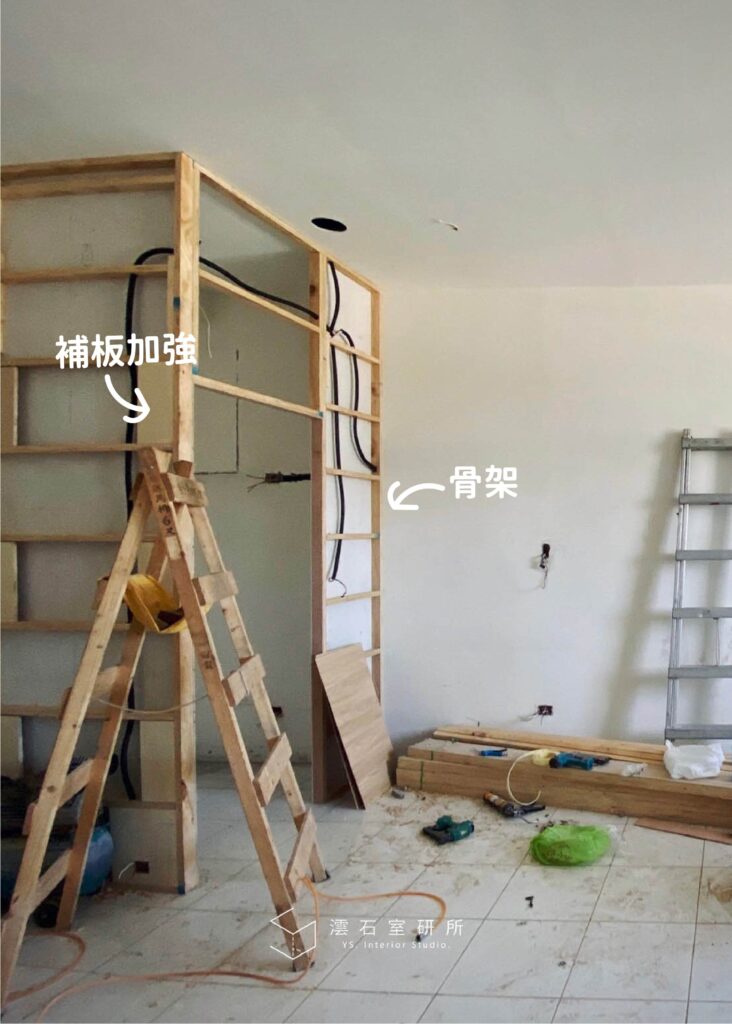 矽酸鈣板本身沒有太大的支撐力,需要以角材輔助做內部的支撐架,且角材之間的跨距不可以過寬,不然矽酸鈣板會容易凹陷變形,