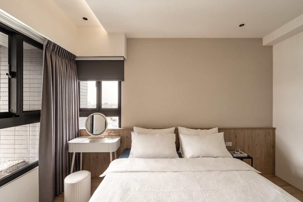 【主臥室】延伸公區設計,同樣運用粉橙暖色的藝術塗料搭配造型門板作為主牆視覺,屋主除了日常保養之外,梳化時習慣搭配桌上型小鏡子使用,我們便將鏡子藏匿於梳裝櫃中,需要時再拉出使用即可。