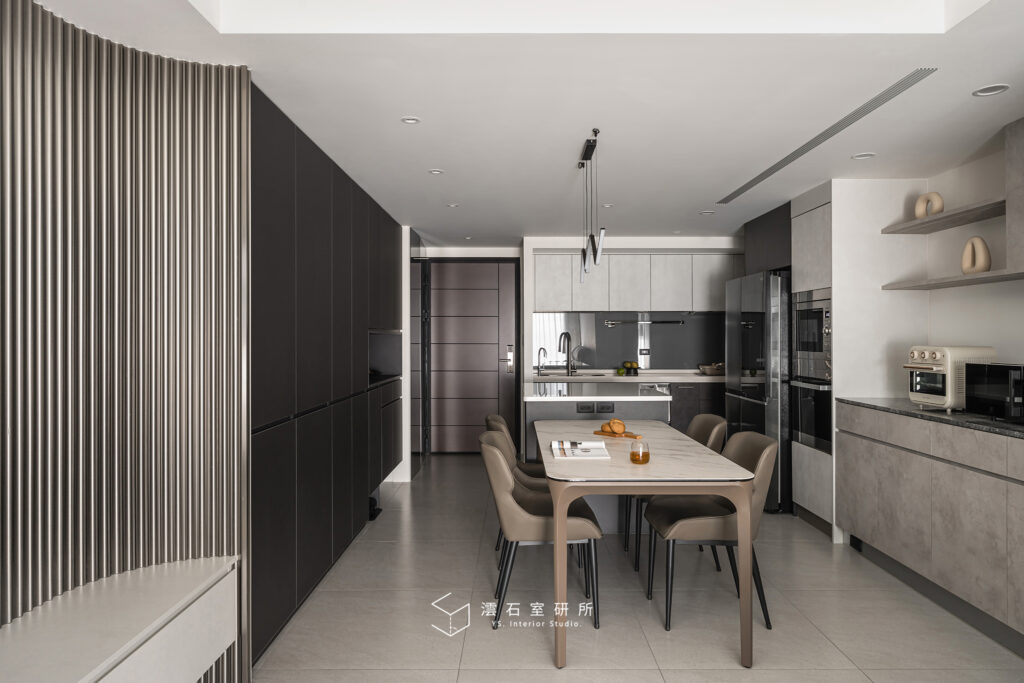 對於生活儀式非常講究的屋主,日常除了替自己規畫旅行之外,同時有蠻長的時間喜歡待在客廳閱讀彈琴與廚房間料理烘焙,於是在此次的設計中,我們將三房改為兩房格局,放大公共空間,將客餐廚空間均勻配比。