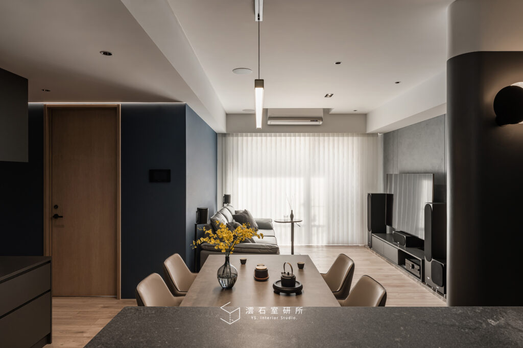 公共區域在住宅設計中的重要性日益提升,尤其是在疫情後,遠距工作與居家辦公成為常態。本案廚房、餐廳與客廳間為開放式設計,整體空間寬敞流暢。屋主經常下廚做菜,我們在中島邊設計一道玻璃拉門,有效隔絕油煙,平時開啟保持空間的通透感外,同時串接視覺連貫性。