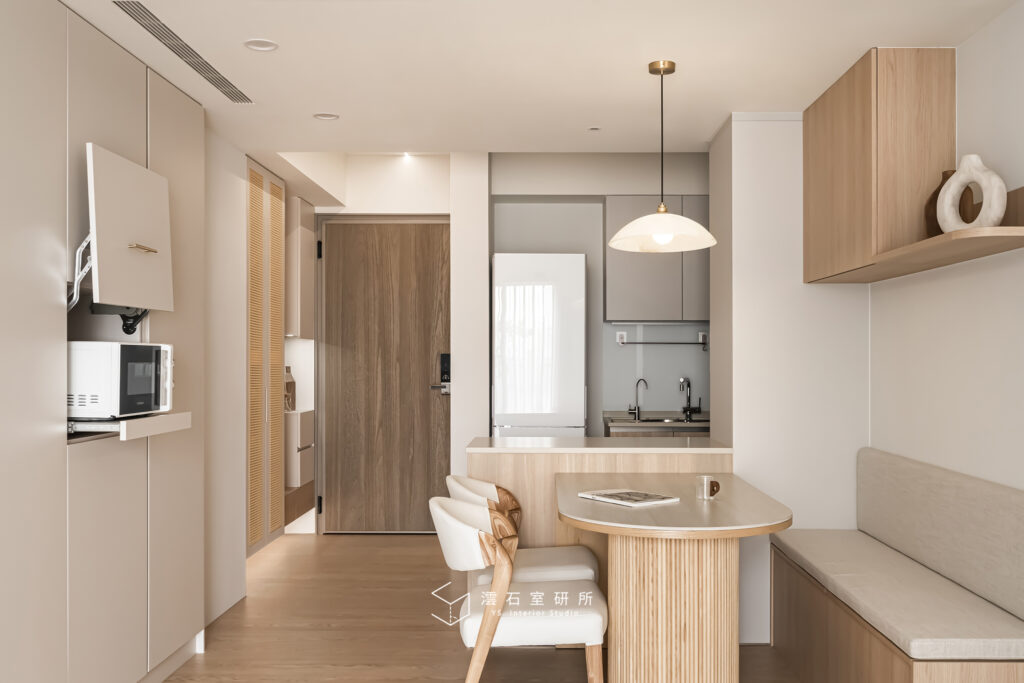 本案室內設計以「奶茶色系」與「溫暖木質」為基調,透過圓弧造型與機能收納設計,在有限的坪數內,打造出通透且充滿細節的居家空間。