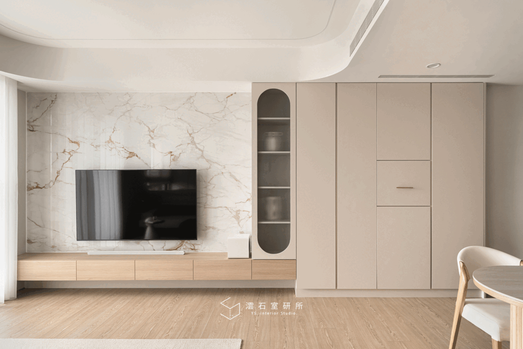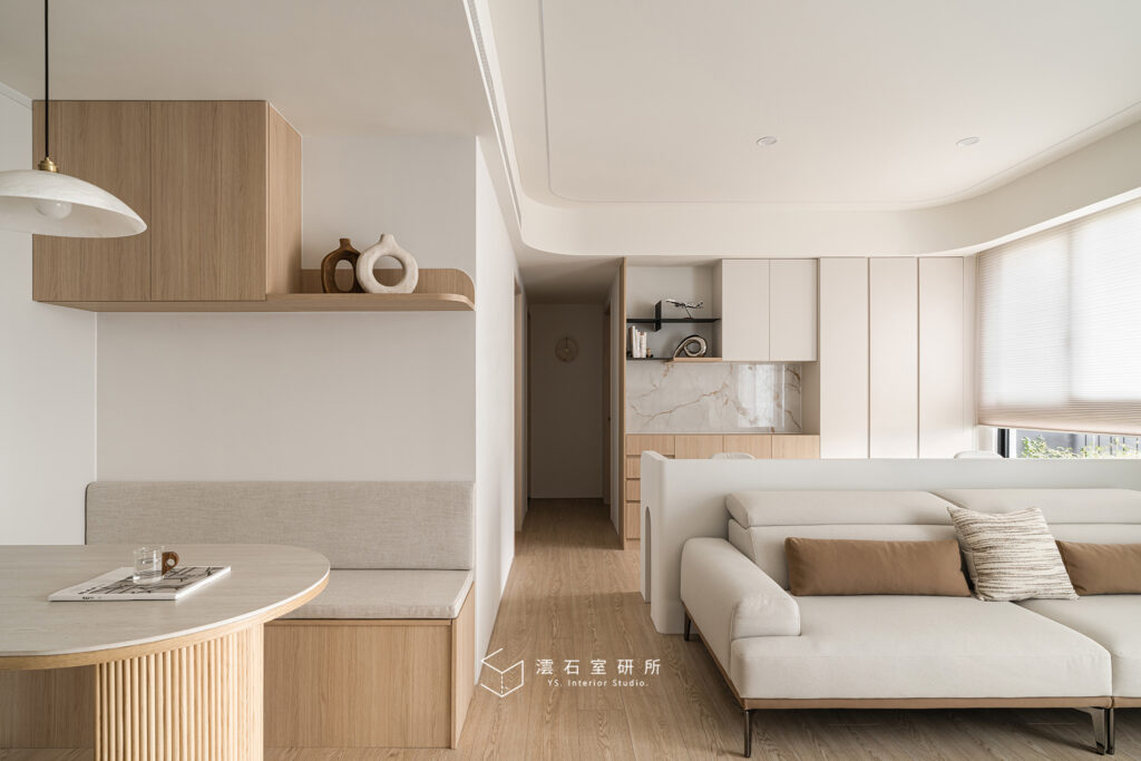 圓弧語彙的運用:從天花板、牆面到櫃體轉角,圓弧能有效中和空間的剛硬,不僅視覺美觀,更能增加行走時的安全性。