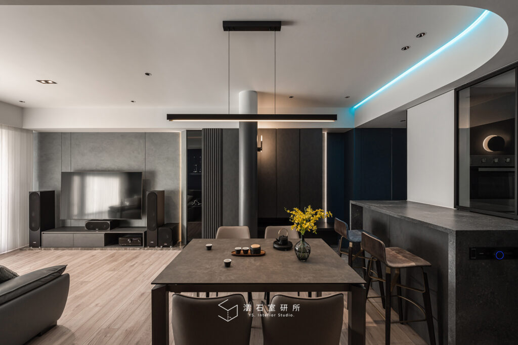 黑的沉穩、白的純粹、灰的平衡,三者交織出一種靜謐又有層次的居家氛圍,恰如兩人日常生活中追求的節奏:簡潔、安定、無壓。澐石室研所以幾何語彙作為主軸,霧面石材、金屬飾條與黑玻交錯運用,讓每一處轉角都不無聊;牆面與地坪大面積使用柔和淺灰作為底色,佐以白色櫃體與黑色點綴,讓整體視覺乾淨卻不顯冷漠。照明則是整個空間氛圍的靈魂,從入門的玄關到餐廳吊燈,再到客廳的間接照明,皆以柔和均光方式減少陰影與壓迫。